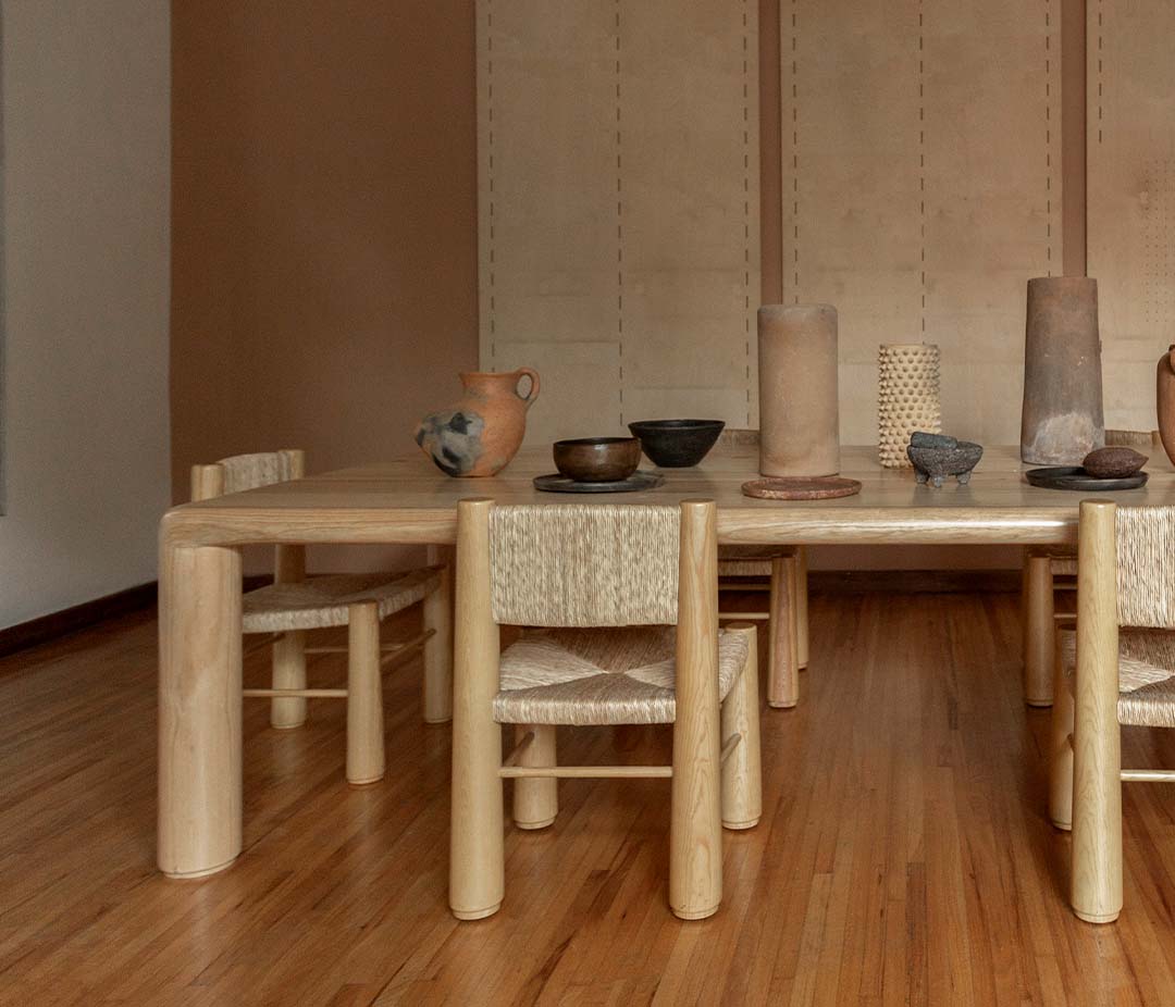 The Vallarta dining table has a woven palm seat and a pine wood structure made of four conical legs that grow in size at the bottom