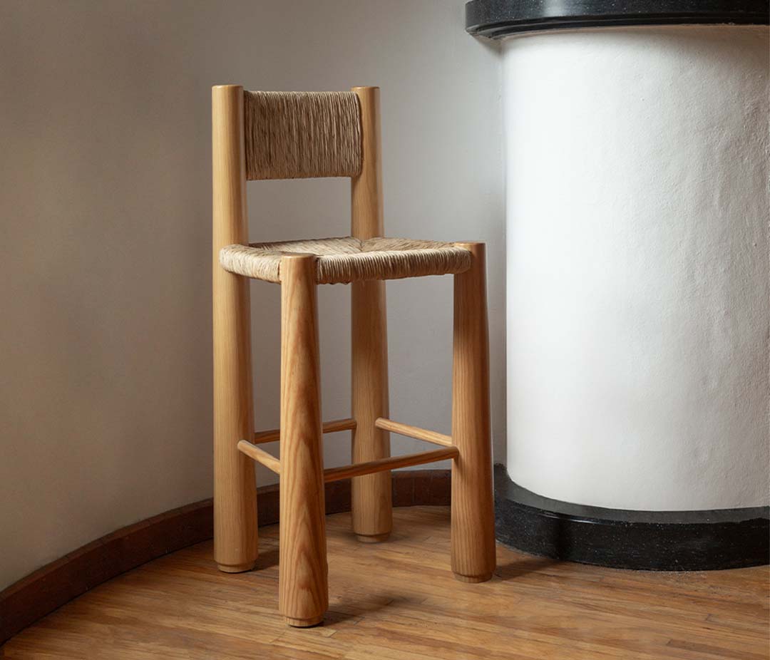 The Vallarta bar stool has a backrest and seat made of woven palm with a pine wood structure made of four conical legs that grow in size at the bottom